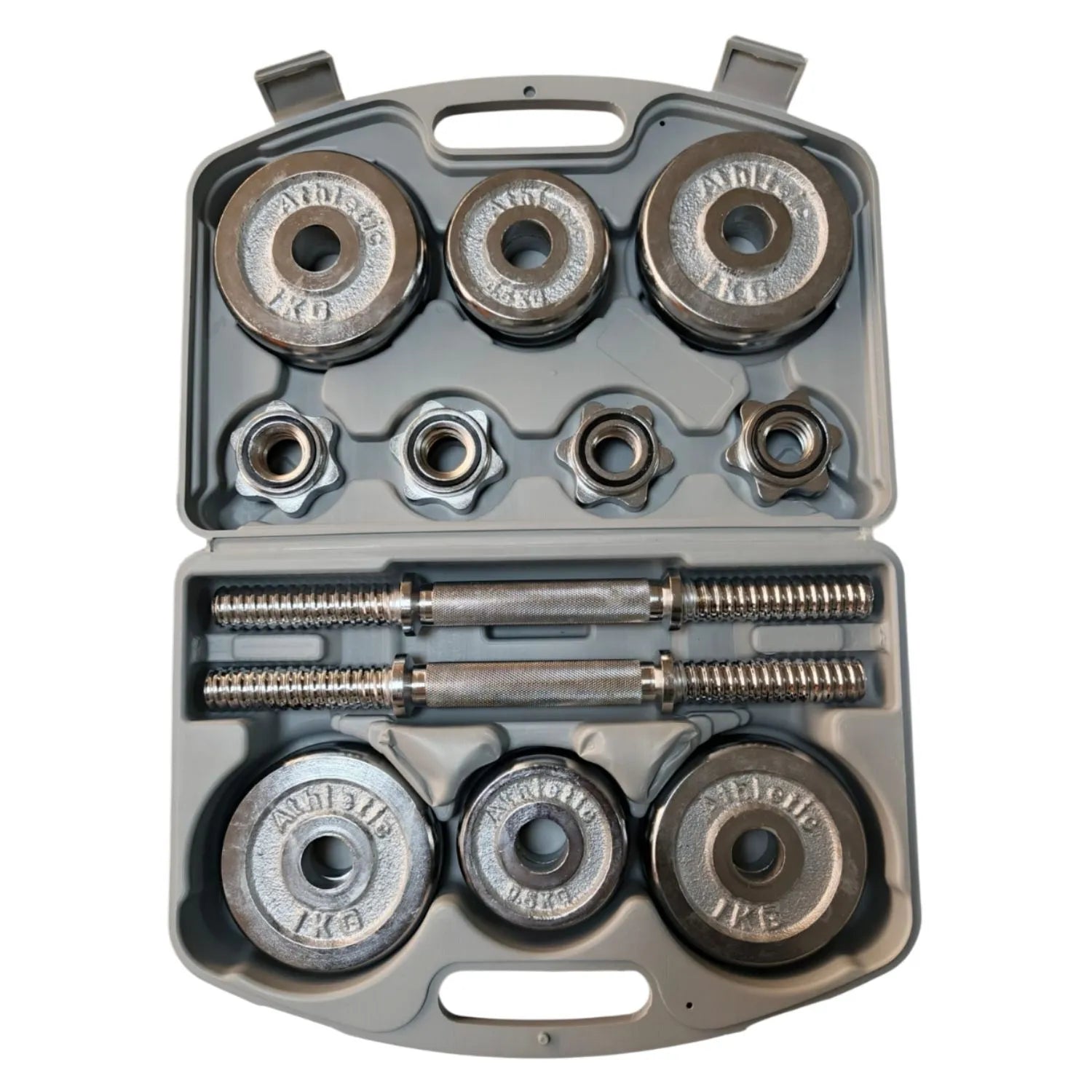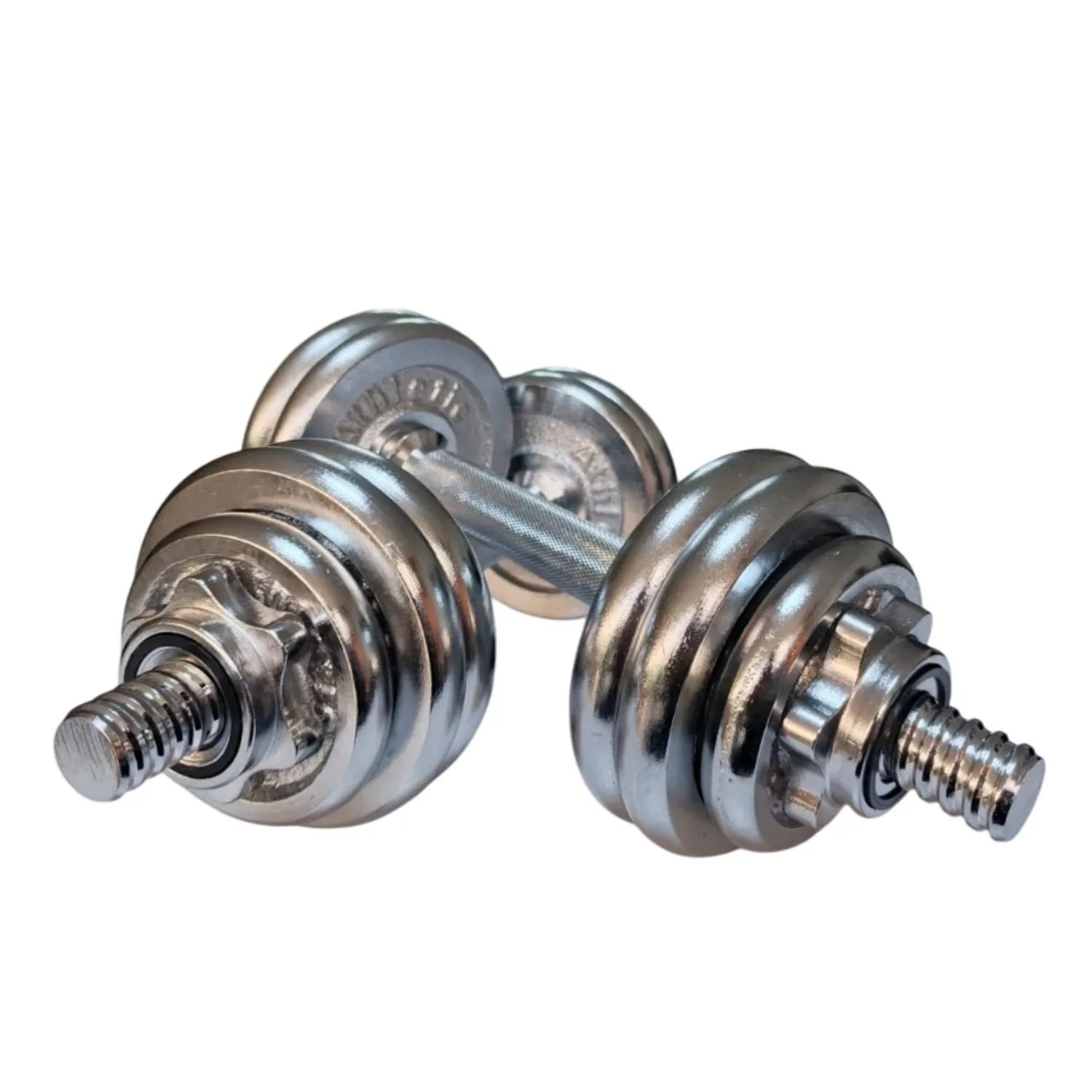 Mancuernas cromadas de 14 kg diseñadas para entrenamientos de fuerza y desarrollo muscular. Su acabado cromado proporciona durabilidad y resistencia a la corrosión, manteniendo su apariencia profesional tras años de uso intenso. El agarre ergonómico facilita movimientos controlados en ejercicios como press, curls y levantamientos compuestos. Ideales para gimnasios, entrenamientos en casa o sesiones de acondicionamiento físico. Cada unidad pesa 14 kg, permitiendo progresión gradual en tu rutina de entrenamiento.