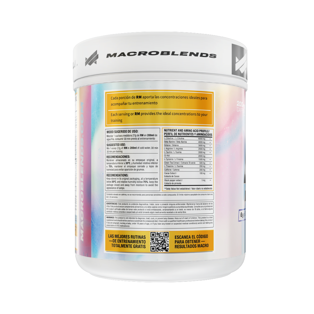 Prepárate para alcanzar nuevos niveles de rendimiento con RM Pre-Workout de Macroblends. ¡Empieza tu entrenamiento con la energía y el enfoque que necesitas para triunfar!