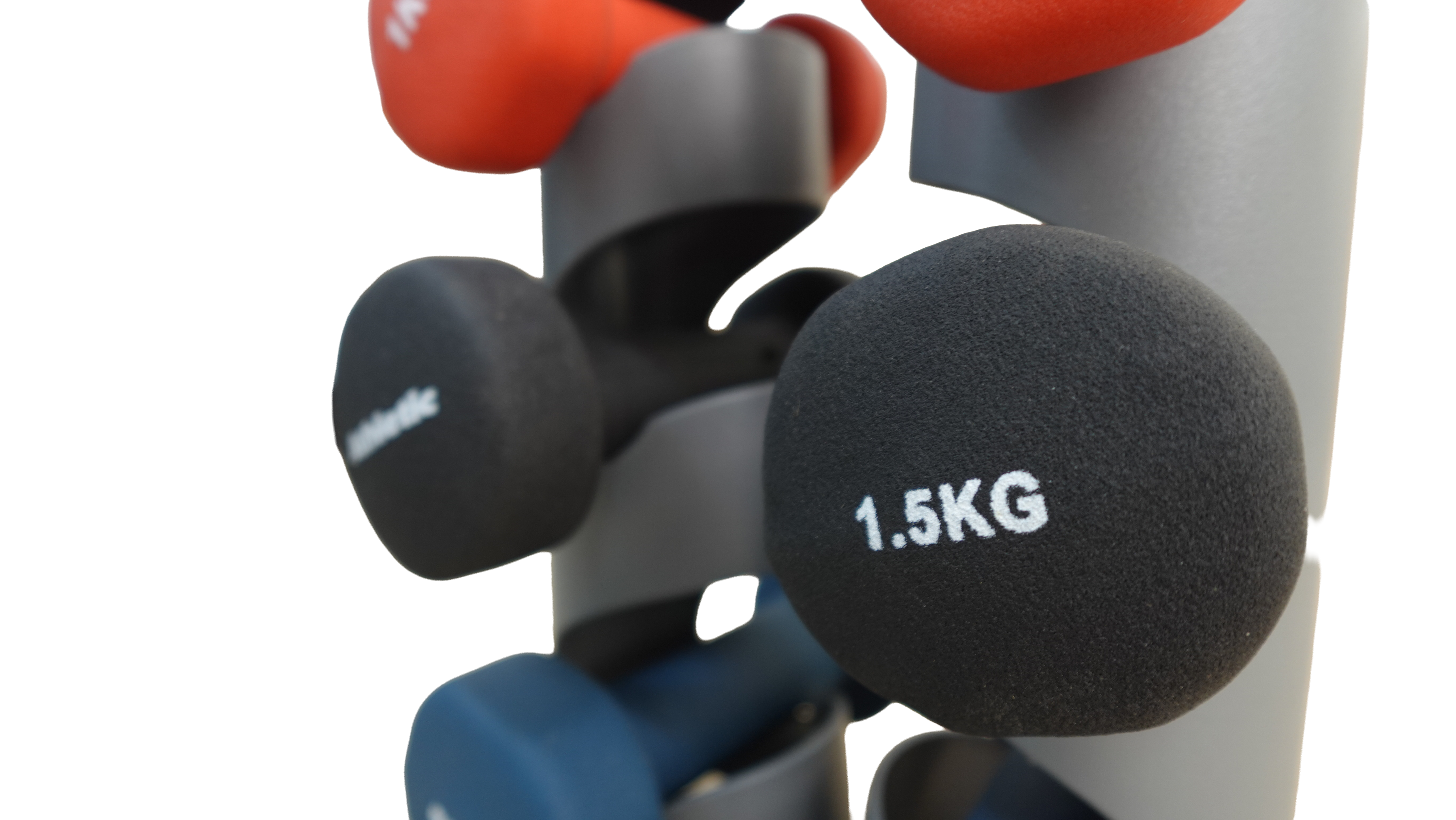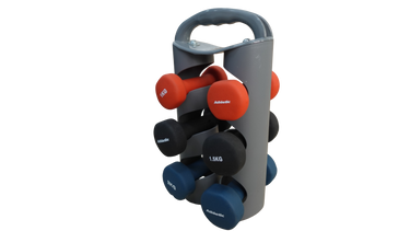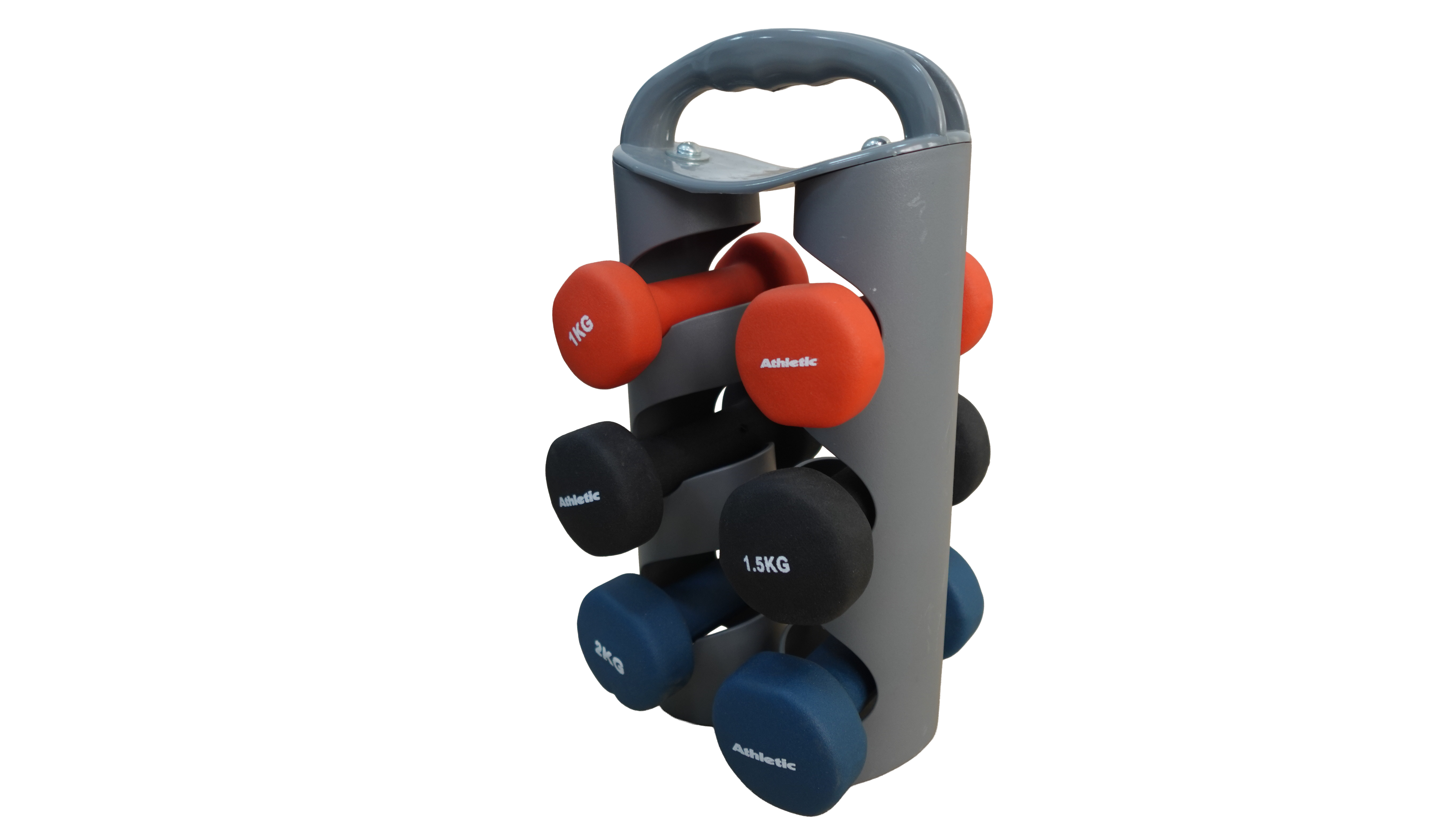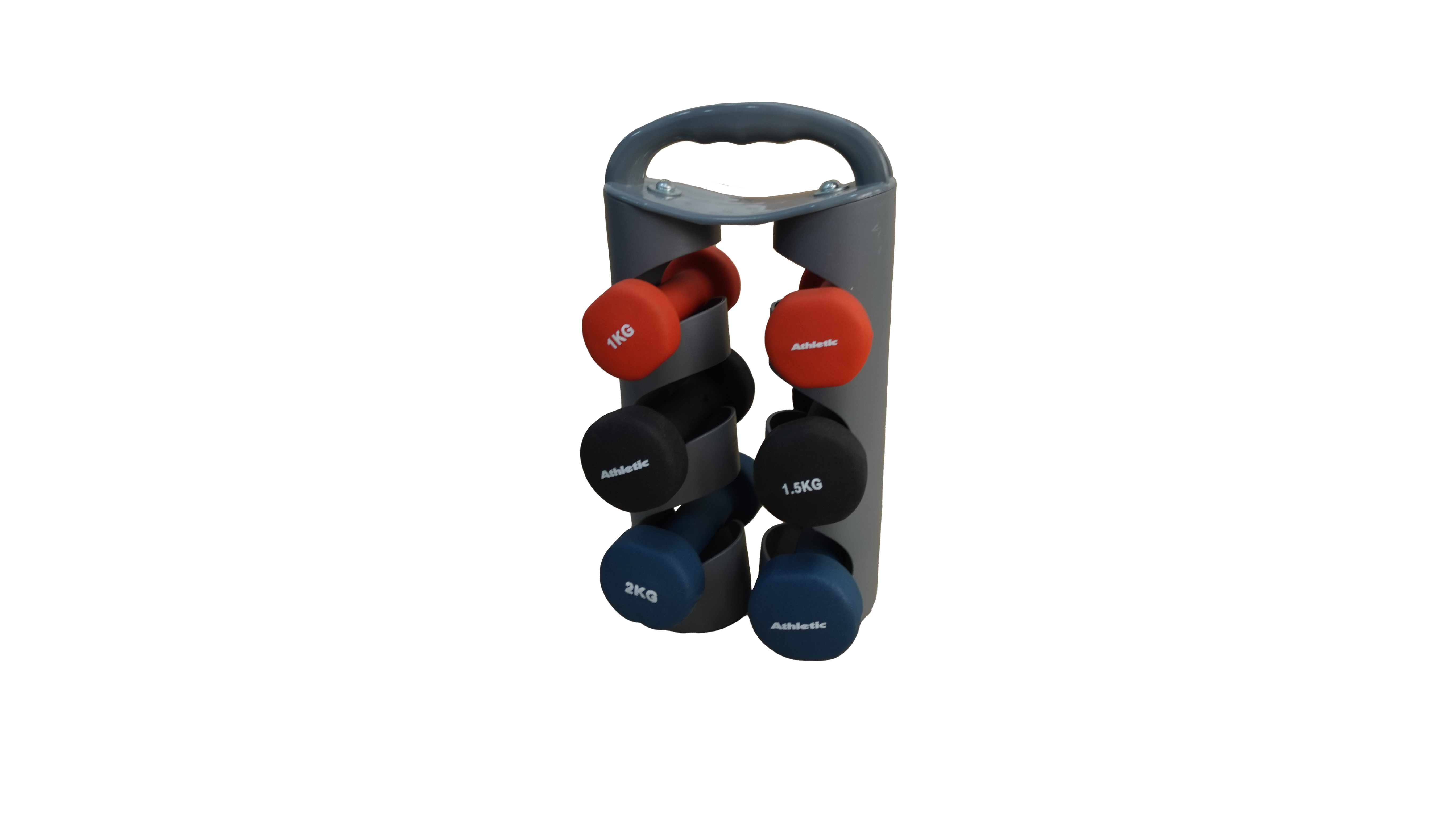Este set de mancuernas incluye pares de 1 kg, 1.5 kg y 2 kg, proporcionando opciones de peso versátiles para distintos niveles de entrenamiento. Vienen con un rack diseñado para mantenerlas organizadas y al alcance, facilitando cambios rápidos durante las rutinas. La variedad de pesos permite trabajar la fuerza y resistencia de manera progresiva, ideal para ejercicios de tonificación y rehabilitación. Su diseño compacto y funcional optimiza el espacio del gimnasio o área de entrenamiento en casa, promoviendo un ambiente ordenado y seguro.